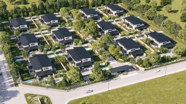 Housing es un desarrollo de casas, cada una con su lote y jardín, pero todas iguales y que se construyen al mismo tiempo. Eso permite una mayor prolijidad, eficiencia en los esfuerzos de construcción, costos, servicios, y se molesta menos a los vecinos que si se construye casa por casa.
