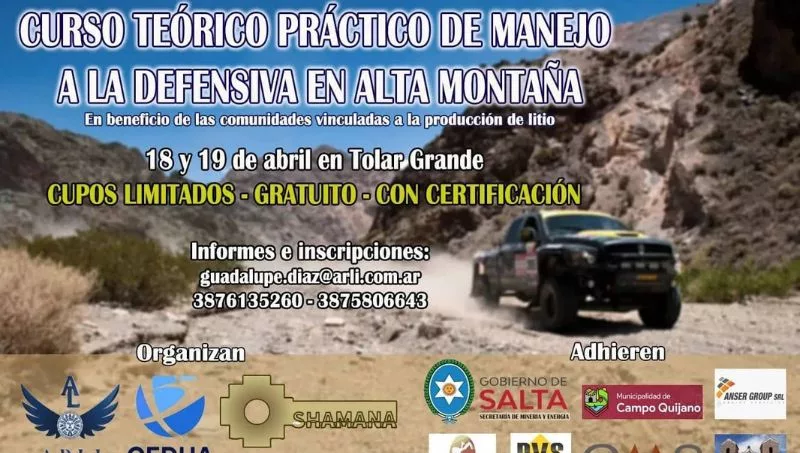 La minera ARLI S.A., dedicada a la exploración de litio en el Salar de Arizaro, en el municipio de Tolar Grande, anunció la realización de un curso gratuito de Manejo Defensivo en Alta Montaña. Este evento se llevará a cabo el próximo jueves 18 y viernes 19 de abril en el Salón Municipal de Tolar Grande.