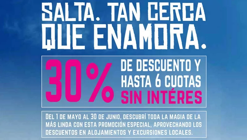 Desde el pasado martes 1 de mayo y hasta el sábado 30 de junio salteños y turistas podrán aprovechar la promoción “Salta, tan cerca que enamora”. Su principal objetivo es incentivar al turismo durante los meses de mayo y junio en toda la Provincia. “Queremos que más turistas venga a disfrutar de la cultura y gastronomía de nuestra provincia y así romper con la estacionalidad”, manifestó el secretario de Turismo, Estanislao Villanueva.