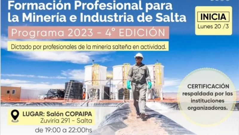 El curso, dictado por profesionales de la minería salteña en actividad, inicia el próximo lunes 20 de marzo y está destinado a técnicos del nivel medio y superior y alumnos de los últimos años de tecnicaturas (existe una amplia gama de ellas, matriculadas o no al COPAIPA). El inicio de cada uno de los 6 módulos de la capacitación estará sujeto a cubrir un cupo mínimo. Las inscripciones pueden ser por módulo o módulos, habiendo algunas promociones con precios especiales al inscribirse en varios módulos o subtemas.