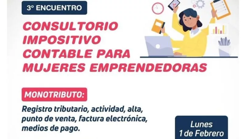 La Municipalidad anunció una nueva capacitación para acompañar y fortalecer a las emprendedoras locales. El tercer “Consultorio Impositivo para Mujeres Emprendedoras”, a cargo de la Subsecretaría de la Mujer de la Municipalidad, será el próximo lunes 1 de febrero, a partir de las 19, a través de Zoom y Youtube. Abordará temas relacionados al monotributo: registro tributario, actividad, alta punto de venta, factura electrónica y medios de pago.