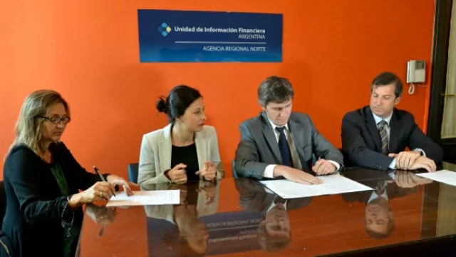 El acuerdo fue firmado esta mañana en la sede de la Unidad de Información Financiera en un acto encabezado por el titular de ese organismo nacional en la provincia, Eduardo Sylvester. Participaron además, el director de Rentas, Facundo Furió; el director General de Inmuebles, Esteban García Bes; el director general de Personas Jurídicas, Rodrigo Martínez Urquiza; y el presidente del Colegio de Escribanos, Mariano Coll Mónico.