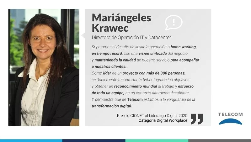 Telecom fue premiada por la exitosa implementación de home working para asesores comerciales, técnicos y áreas staff de la compañía, realizada en tan solo siete días, durante la semana previa a la declaración de Aislamiento Social Preventivo y Obligatorio. Este cambio de modalidad laboral que acompañó el contexto sanitario se realizó en tiempo récord gracias a la transformación digital y cultural que la empresa viene transitando desde 2019.