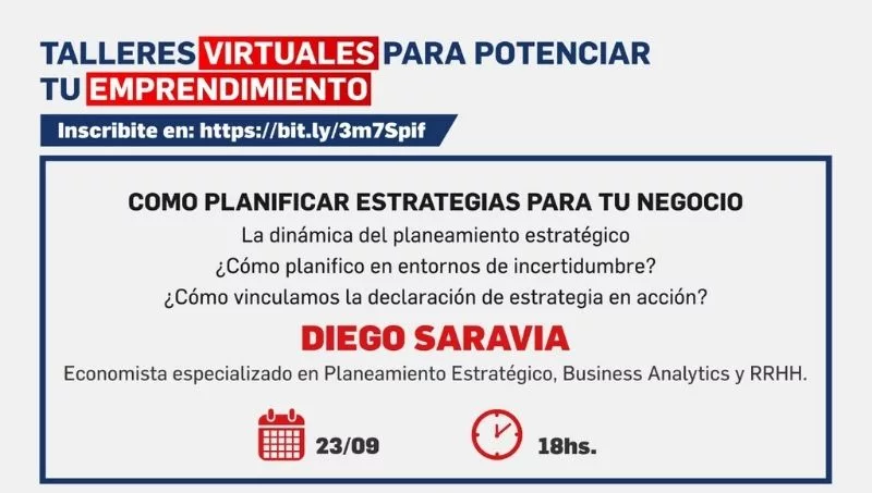 Diego Saravia, director general de Comercio Exterior de la Provincia, será el encargado de dictar el taller, en el que expondrá sobre la dinámica del planeamiento estratégico como una herramienta clave para definir lo que los emprendedores desean lograr con su emprendimiento. Esto les permitirá observar el ecosistema de negocios y el contexto de manera amplia y completa.