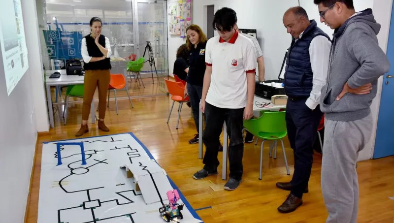 Los dos Joaquín, Ian y Alejandro recibieron al ministro de Economía, Roberto Dib Ashur, y a la directora de Economía del Conocimiento, Lorena Trovato, quienes se interesaron en los últimos detalles del proyecto. También estuvieron el director del Instituto, Gustavo Viollaz, y la coordinadora pedagógica de la institución, Cecilia Budeguer.