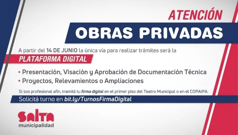 Con el objetivo de agilizar, simplificar y generar mayor eficiencia y transparencia a trámites de obras privadas, la Municipalidad de Salta digitaliza procesos desde el 14 de junio. Se espera con esto lograr una comunicación inmediata y ágil  entre el profesional y la Municipalidad.