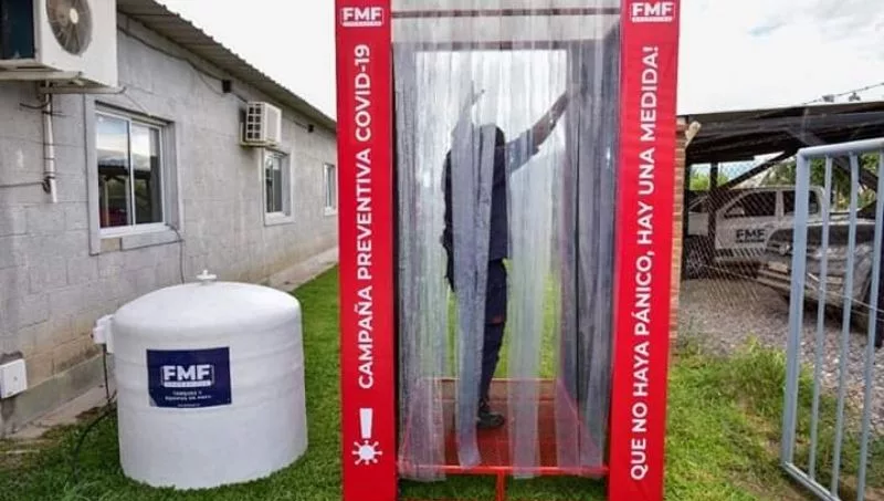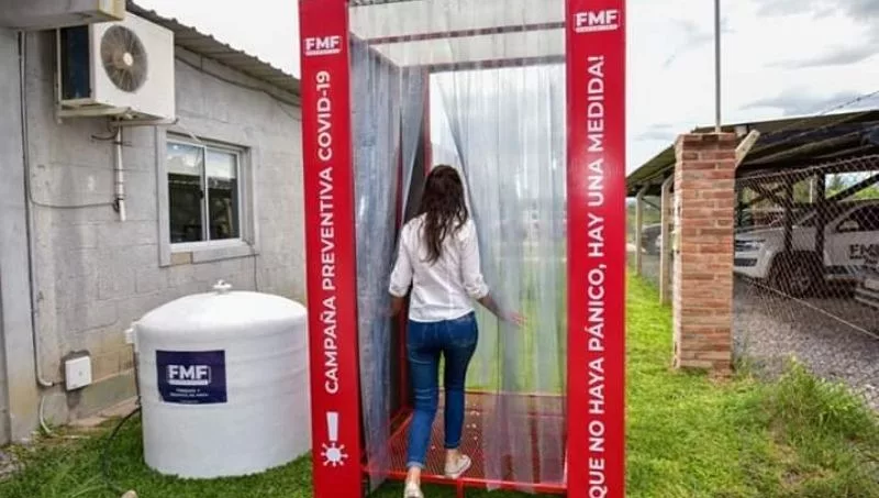 Recientemente FMF fue noticia por la donación de 60 mil litros de lavandina a entidades de bien público y a personas en situación de vulnerabilidad. Pero la semana pasada su nombre volvió a estar presente en los medios de comunicación por la donación de una nueva cámara de desinfección instalada en la intersección de Belgrano y Mitre, que se sumó a la ya donada al Hospital San Bernardo. La misma cuenta con un tanque en PRFV conectado a la cabina, donde se lleva a cabo el proceso de limpieza química mediante micro aspersores. En segundos cualquier individuo esta desinfectado. Los túneles son de diferentes tamaños, según la cantidad de personas.