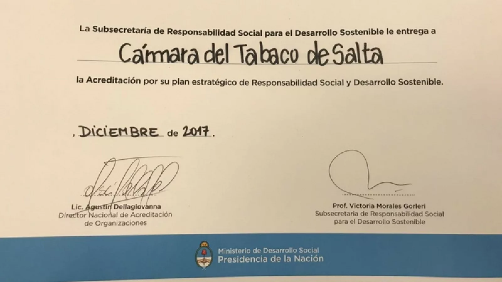 La Subsecretaría de Responsabilidad Social para el Desarrollo Sostenible, del Ministerio de Desarrollo Social de la Nación, acreditó a la Cámara del Tabaco de Salta en el Registro Único de Organizaciones de Responsabilidad Social.