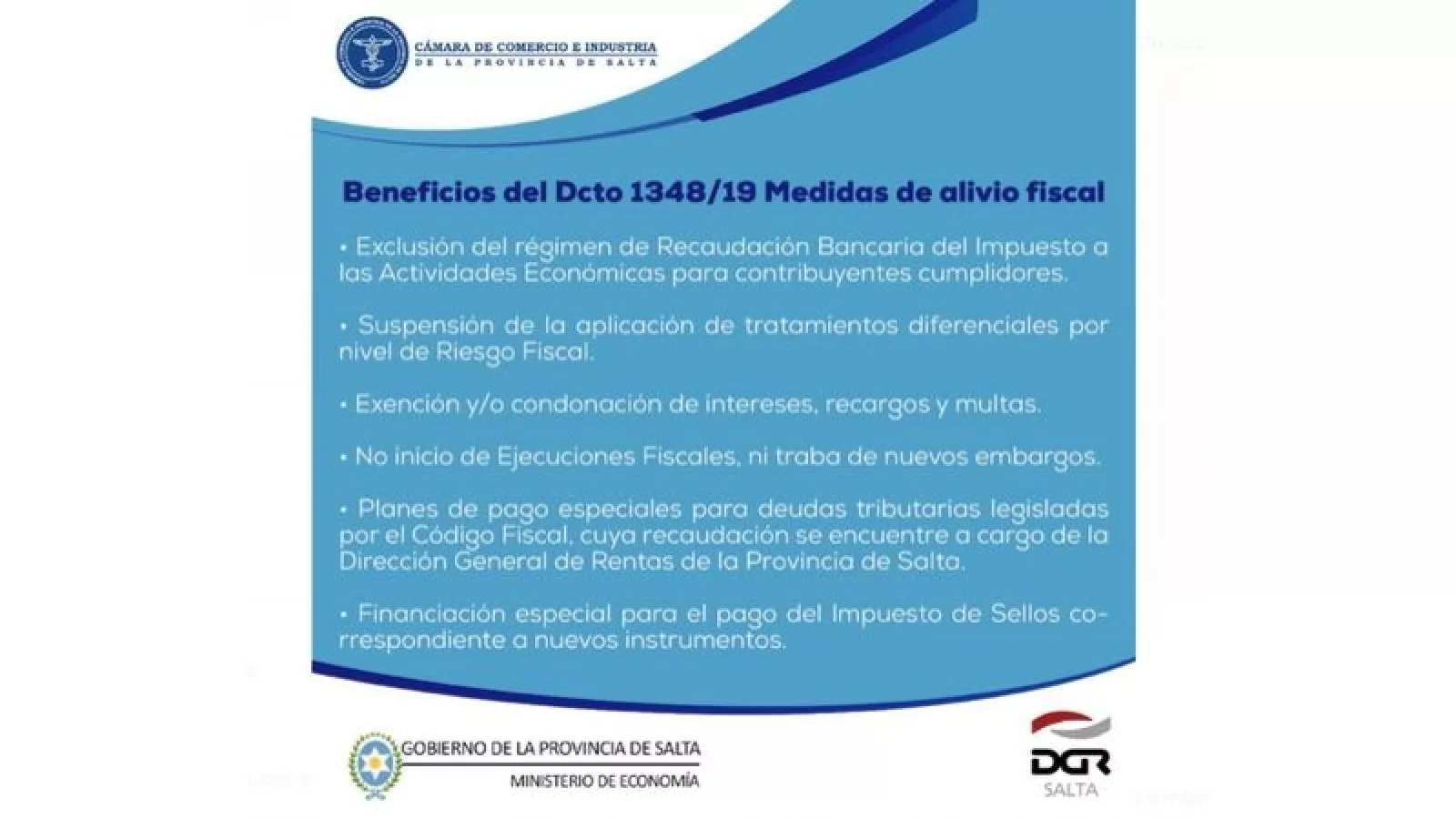 Luego de este acuerdo, el Gobierno Provincial puso en vigencia el Decreto 1.348 de Alivio Fiscal, para las pymes que tuvieran obligaciones tributarias, intereses, recargos y multas devengados al 31 de agosto de 2019. Esta medida estará vigente hasta el 27 de diciembre de este año. Se encuentran alcanzadas por este beneficio, todas las obligaciones tributarias legisladas por el Código Fiscal y que recauda la Dirección General de Rentas de la Provincia.