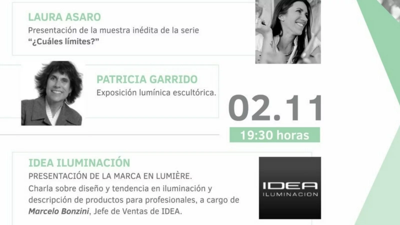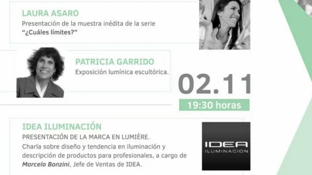 El próximo jueves 2 de noviembre a las 19.30 Lumiere Concept Design inaugura una puesta en escena que abarcará las nuevas piezas de la serie “¿Cuáles límites?” –presentada anteriormente en el Consulado Argentino en Nueva York– de la artista plástica Laura Asaro; y las obras de arte lumínicas escultóricas de Patricia Garrido, presentadas hace pocos días en la Feria D&D + DArA. Habrá además un show musical para acompañar esta presentación, con gastronomía y vinos de altura conjugados en el mejor escenario para el disfrute.