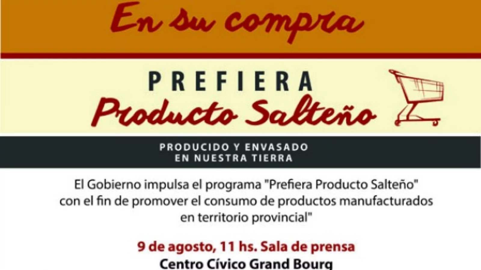 El Gobierno provincial, a través del Ministerio de Ambiente y Producción Sustentable, presentará hoy el programa "Prefiera Producto Salteño", cuyo objetivo es promover, difundir y estimular el consumo de productos manufacturados en Salta. La convocatoria es a las 11, en la Sala de Prensa de Casa de Gobierno.