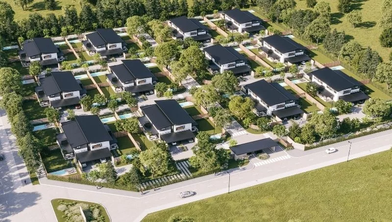 Housing es un desarrollo de casas, cada una con su lote y jardín, pero todas iguales y que se construyen al mismo tiempo. Eso permite una mayor prolijidad, eficiencia en los esfuerzos de construcción, costos, servicios, y se molesta menos a los vecinos que si se construye casa por casa.