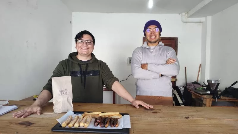 Emiliano es cocinero y se jacta de tener una vasta experiencia en el rubro de la pastelería también. Tal vez por eso, le resultó relativamente sencillo replicar la receta de los churros porteños que marcaron su viaje. Leo es estudiante de Biología e igualmente amante de la buena comida, por lo que está en condiciones de aportar sus conocimientos y su empirismo: un socio completo.