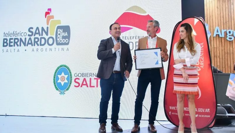 Por otra parte, y también en el marco de la FIT, el Teleférico San Bernardo recibió el reconocimiento de la distinción Marca País otorgada por el Ministerio de Turismo de la Nación. La entrega la realizó el pasado martes la secretaria de Promoción Turística de la Nación, Yanina Martínez, quien destacó el potencial del teleférico. En este acto recibieron el reconocimiento el ministro Peña y el presidente del Teleférico San Bernardo, Martín Miranda.