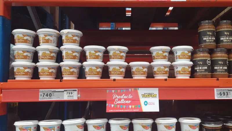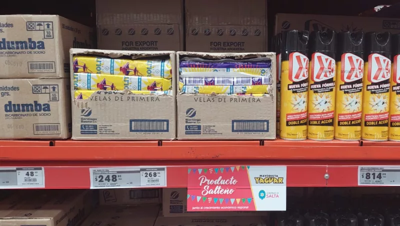 Los productos de diferentes marcas están identificados con cartelería especial en las góndolas, para que el comprador ubique a la producción salteña que forma parte de la feria, en los rubros lácteos, pastas, limpieza, agua mineral, sodas, gaseosas, legumbres, snacks, cervezas y vinos, entre otros.
