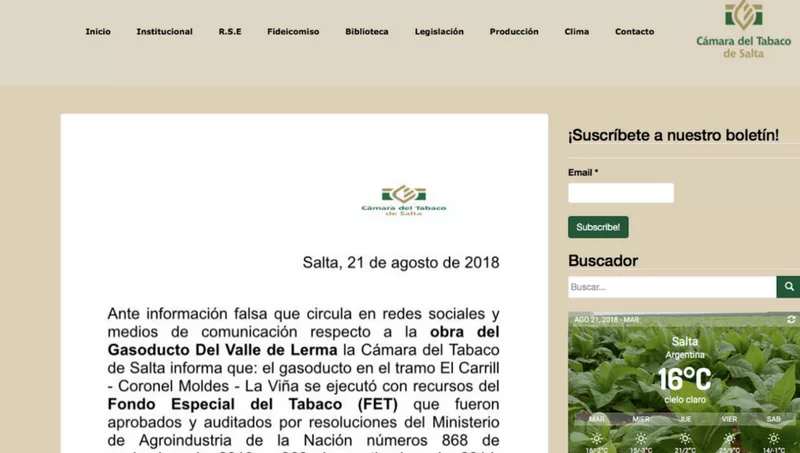 Por la tarde, la Cámara de Tabaco de Salta emitió un comunicado en el que aclaró: “Ante información falsa que circula en las redes sociales y medios de comunicación respecto a la obra del Gasoducto del Valle de Lerma, la Cámara del Tabaco de Salta informó que el gasoducto en el tramo El Carril – Coronel moldes- La Viña se ejecutó con recursos del Fondo Especial del Tabaco que fueron aprobados y auditados por resoluciones del Ministerio de Agroindustria de la Nación N° 868, de noviembre de 2010 y 368 de setiembre de 2014. Cabe destacar que el toral de la inversión de la obra fue de 7.865.629 dólares.