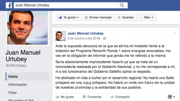 Luego de conocerse los resultados de la licitación, el gobernador Juan Manuel Urtubey, salió responder suspicacias respecto de su opinión, a través de su cuenta de Facebook: