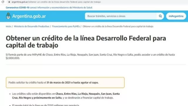 El Ministerio de Desarrollo Productivo de la Nación tiene en marcha la línea de créditos Desarrollo Federal para capital de Trabajo, a través de la cual destinó un total de 200 millones de pesos para cada provincia participante, entre las que están incluidas Salta, Chaco, Entre Ríos, La Rioja, Neuquén, San Juan, Santa Cruz y Río Negro. El programa está vigente el próximo miércoles 31 de marzo y se otorgarán créditos hasta agotar el cupo disponible.