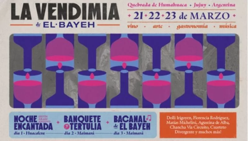La Bodega El Bayeh llevará a cabo su vendimia y para celebrarlo, propone la tercera edición de La Vendimia de El Bayeh, un festival cada vez más instalado en la Quebrada de Humahuaca. “Siempre es una buena oportunidad para dar a conocer la cultura de nuestra región. Los vinos como epicentro, sumando la gastronomía, la música y todo lo que conforma esta cultura tan rica del norte argentino”, comenta Daniel Manzur, vitivinicultor y director de Bodega El Bayeh.