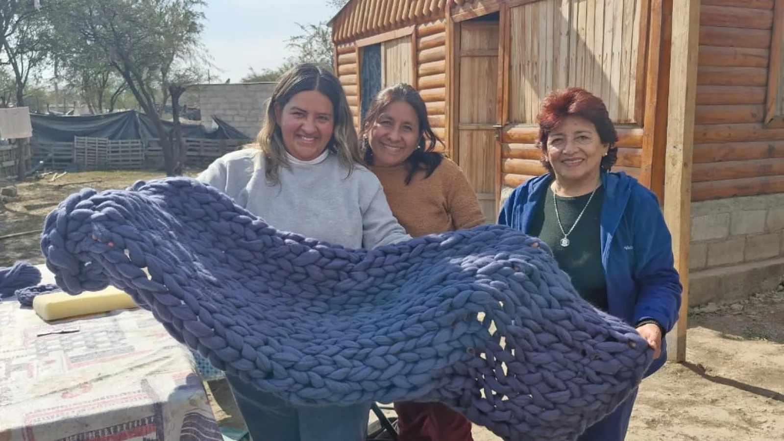 Gracias a las donaciones de Monseñor Dante Bernacki y la comunidad de la Parroquia del Tránsito, fue posible comprar lanas y comenzar este taller en el asentamiento. Cada mamá pudo tejer una manta XXL, una bufanda y así abrigar a su familia con sus propias manos.