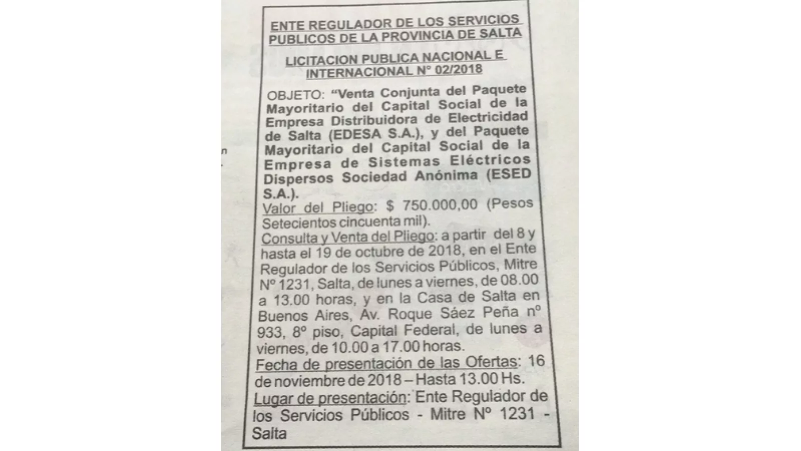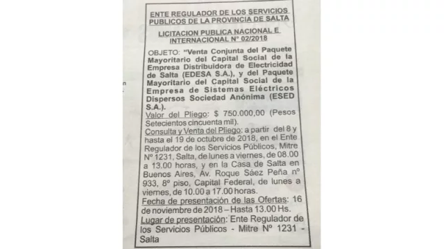 Una publicación aparecida ayer en medios gráficos locales generó sorpresa e inquietud. El Ente Regulador de los Servicios Públicos convocó a una licitación pública nacional e internacional para la “venta conjunta del paquete mayoritario del Capital Social de la Empresa Distribuidora de Electricidad de Salta (EDESA S.A.) y del paquete mayoritario del Capital Social de la Empresa de Sistemas Eléctricos Dispersos Sociedad Anónima (ESED S.A.)".