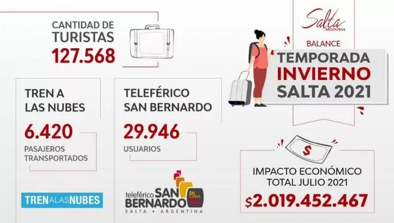 Salta conserva su liderazgo como destino turístico de referencia en el país, más de $2 mil millones (para ser precisos $2.019.452.467) ingresaron a la provincia en la temporada de invierno. Desde el 9 de julio al 31 del mismo mes, 127.568 turistas eligieron Salta para sus vacaciones; entre otros aspectos señalaron que la provincia deslumbra por sus paisajes, lugares históricos, hospitalidad y gastronomía.