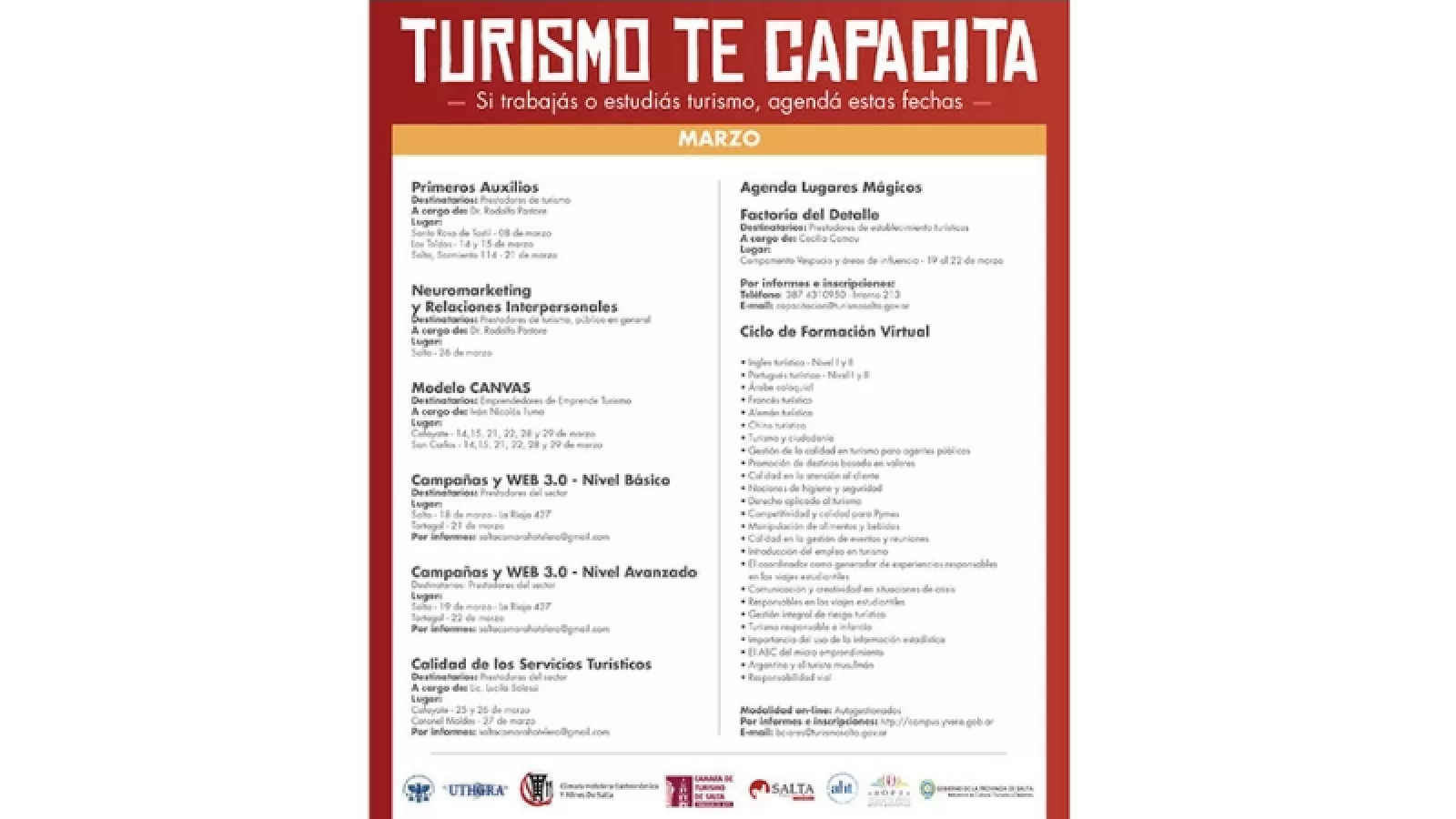 Durante este mes el Ministerio de Cultura, Turismo y Deportes junto a las cámaras y sindicato del sector, brindarán capacitaciones gratuitas de formación para prestadores turísticos. Los cursos forman parte del Programa Anual de Formación para el sector turístico, y se dictarán en ciudad de Salta, Los Toldos, San Carlos Tartagal, Cafayate, Coronel Moldes y Campamento Vespucio.