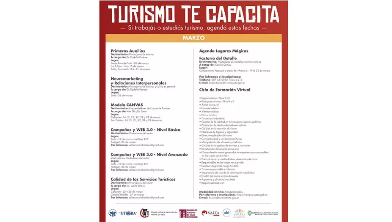 Además los días 25 y 26 de marzo en Cafayate y el miércoles 27 en Coronel Moldes se realizará el curso Calidad en los Servicios Turísticos con el objetivo de que los participantes visualicen los aspectos que constituyen a la calidad integral del destino turístico como producto turístico global y todas aquellas herramientas que permitan medirla y monitorearla.