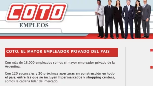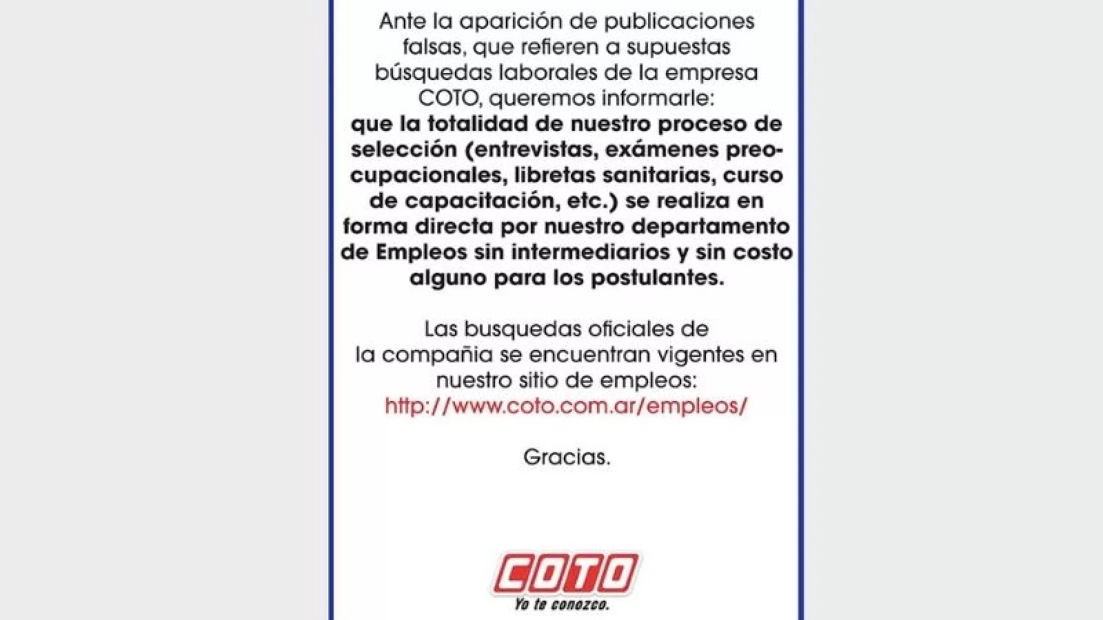 En el mismo advierten que “ante la aparición de publicaciones falsas que refieren a supuestas búsquedas laborales de la empresa COTO, la firma informa que la totalidad de su proceso de selección (entrevistas exámenes preocupacionales, libretas sanitarias, cursos de capacitación, etcétera) se realiza en forma directa por nuestro departamento de empleo, sin intermediarios y sin costo alguno para los postulantes. Las búsquedas oficiales de la compañía se encuentran vigentes en nuestro sitio de empleo http://www.coto.com.ar/empleos”.
