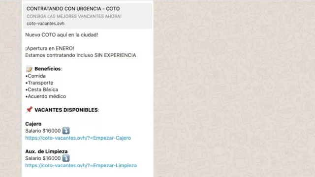 En las redes sociales y grupos de WhatsApp circulan ofertas laborales de empresas de renombre solicitando personal para supuestas nuevas sucursales que abrirán en la provincia. Hace meses pasó con la firma Coca Cola y ahora es con COTO. En ambos casos se trata de un fraude.