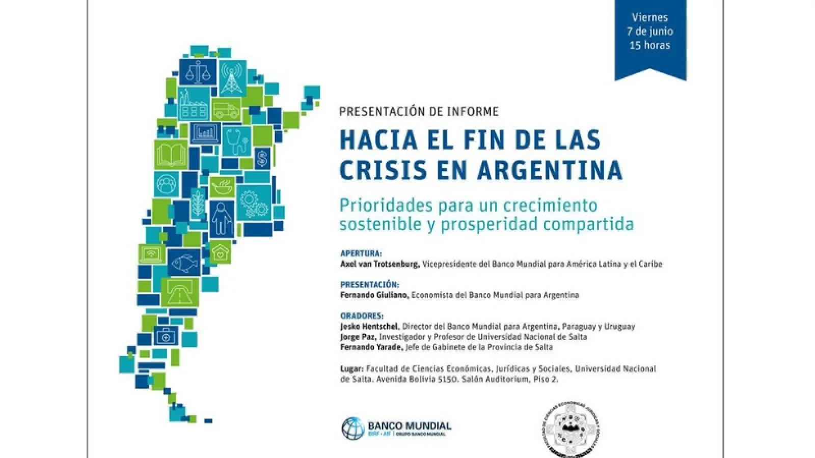 El Banco Mundial presenta el informe "Hacia el fin de las crisis en Argentina" hoy viernes 7 de junio a 15 en el Salón Auditorio de la Facultad de Ciencias Económicas de la UNSa.