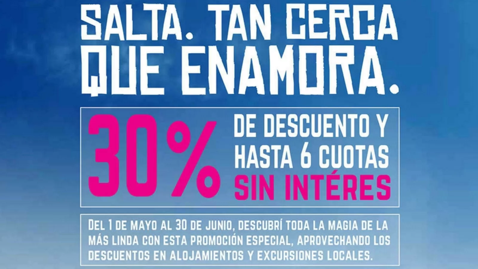 Desde el pasado martes 1 de mayo y hasta el sábado 30 de junio salteños y turistas podrán aprovechar la promoción “Salta, tan cerca que enamora”. Su principal objetivo es incentivar al turismo durante los meses de mayo y junio en toda la Provincia. “Queremos que más turistas venga a disfrutar de la cultura y gastronomía de nuestra provincia y así romper con la estacionalidad”, manifestó el secretario de Turismo, Estanislao Villanueva.