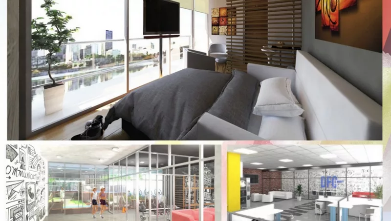 El proyecto, que comenzó a ejecutarse en noviembre de 2017, cuenta con 65 unidades monoambientes en diez unidades por piso, que van desde los 25 a los 32 metros cuadrados. Cada unidad contiene un sector de uso semipúblico, living y una pequeña cocina; y un sector privado, dividido por separadores virtuales, compuestos por un área privada y el baño. Todos tienen balcón en el ancho del departamento y vista este-oeste. En el sector delantero, además del futuro restaurante se ofrecerá un sector para oficinas. Cuenta con cocheras para 35 autos lo que permite abastecer a casi el 50% de los departamentos. Tendrá un amplio lobby de espera en cada piso y una fachada liviana, con hormigón a la vista prácticamente todo vidriado, tanto en el frente como en el contrafrente. El gimnasio estará en el primer piso, y ya está disponible para que alguna empresa lo adquiera e incorpore clientes más allá de los propietarios del edificio. Esos son los puntos clave, que advirtieron los desarrolladores, para que se convierta en una comunidad, concepto éste que fue eje del emprendimiento desde que era solo un bosquejo en un papel.