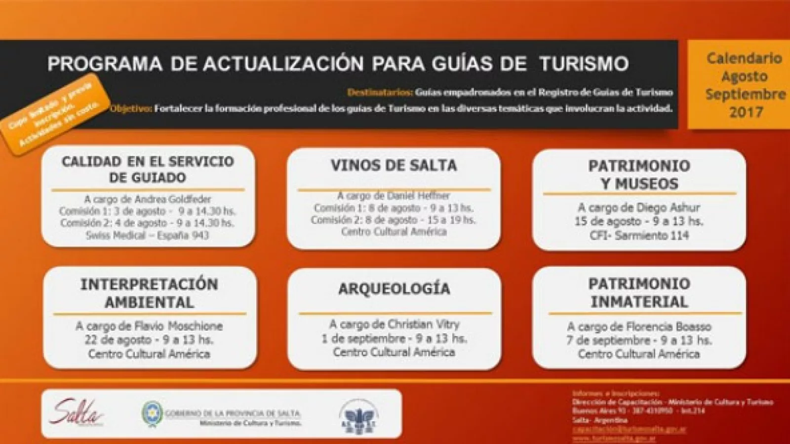 Por informes e inscripciones se puede comunicar con la Dirección de capacitación del Ministerio de Cultura y Turismo al (01387) 4310950 interno 214 o por mail aquí.
