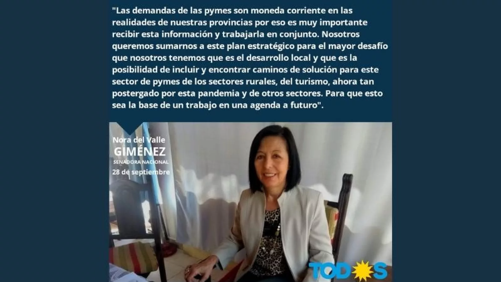 La presentación de Merediz fue calificada como un “verdadero plan estratégico” por el senador José Mayans y con similar intención la presidenta de la Comisión, Nora Giménez manifestó que “las demandas de las pymes son moneda corriente en las realidades de nuestras provincias por eso es muy importante recibir esta información. Nosotros queremos sumarnos a este plan estratégico para concretar el mayor desafío que tenemos que es el desarrollo local y la posibilidad de incluir y encontrar caminos de solución para este sector”.
