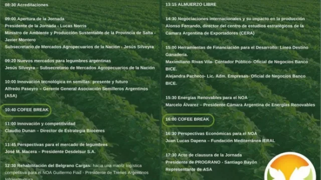 “Mercados, Desarrollo y Competitividad, buscando alternativas para el desarrollo del NOA”. Así se denominan las II Jornadas Anuales organizado por la Asociación de Productores de granos del Norte (Prograno) y la Asociación de Semilleros Argentinos (ASA), que se desarrollará hoy a partir de las 8.30 en el Hotel Sheraton de Salta. La actividad, que se extenderá hasta las 18.30, es abierta para productores, empresarios, comerciantes, ingenieros agrónomos, estudiantes, periodistas y profesionales en general. Se pretende que el encuentro sea un espacio de participación, actualización y generador de acciones para todo el NOA.