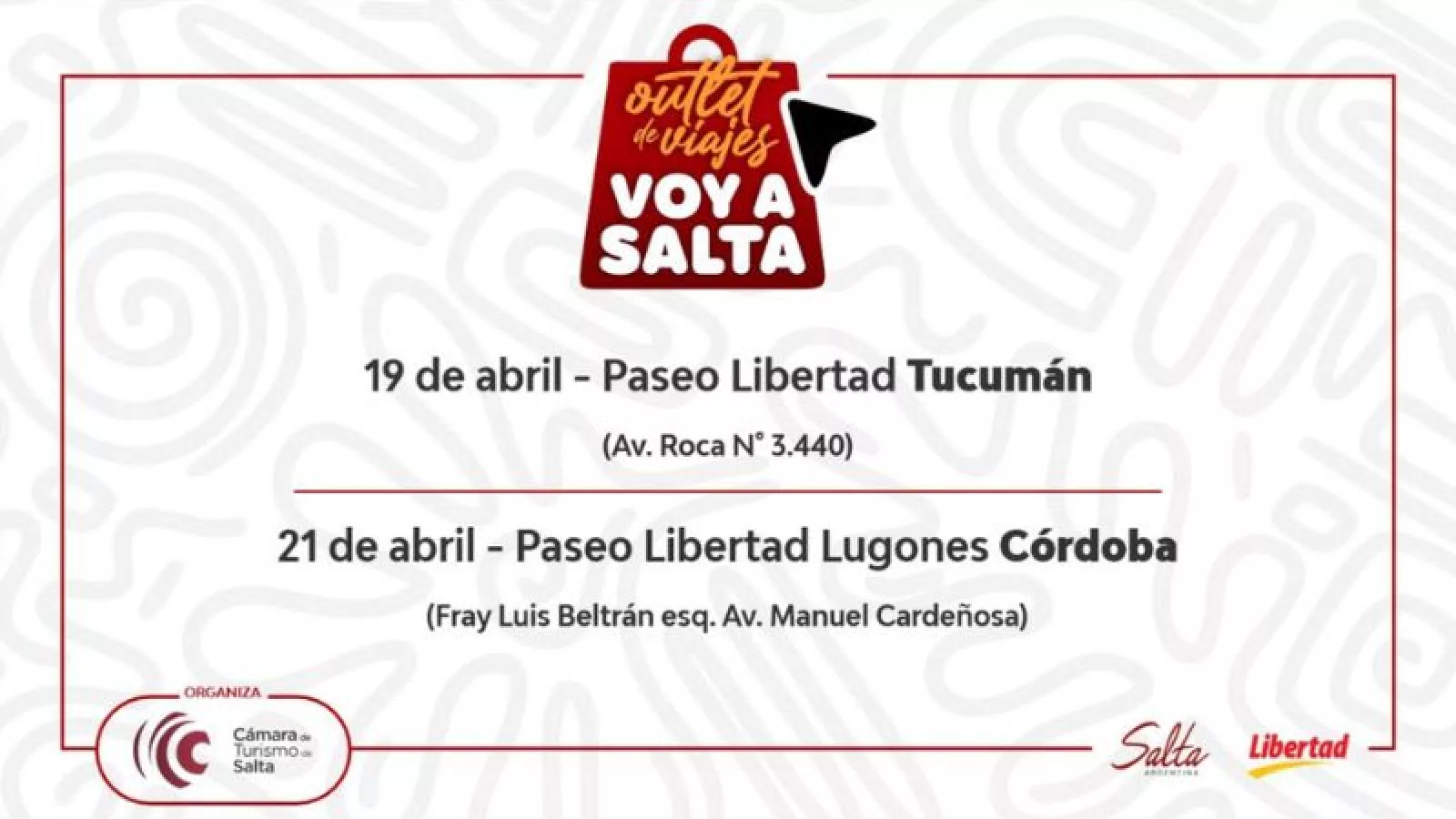 Este fin de semana los asociados de la Cámara de Turismo de Salta realizará los primeros Outlet de Viajes “Voy a Salta”. Hoy viernes estarán presentes en el Paseo Libertad (Av. Roca 3340) de San Miguel de Tucumán, en el horario de 14 a 22; y el domingo 21 harán lo mismo en el Paseo Libertad Lugones (calle Fray Luis Beltrán y Av. Manuel Cardeños) de Córdoba, desde las 12 y hasta las 20.