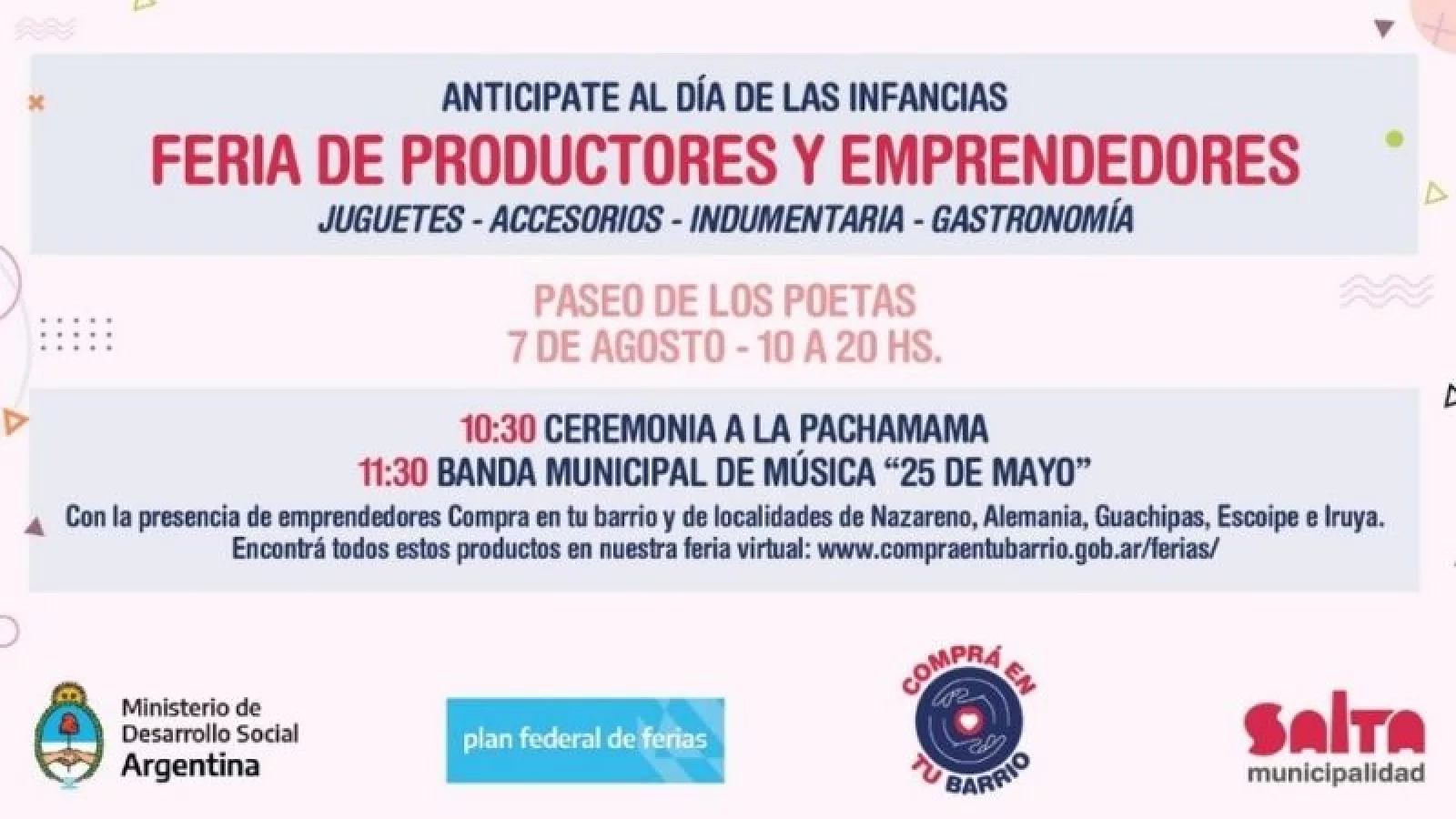 Todos los meses, en el marco del Plan Nacional de Ferias se realiza la actividad en conjunto entre la Municipalidad de Salta y el Ministerio de Desarrollo Social de Nación. El objetivo es brindar vías de comercialización y promoción para pequeños emprendedores locales.