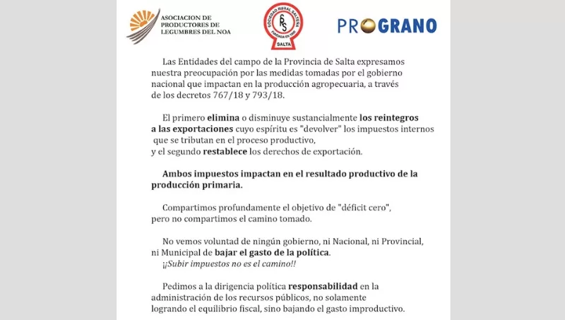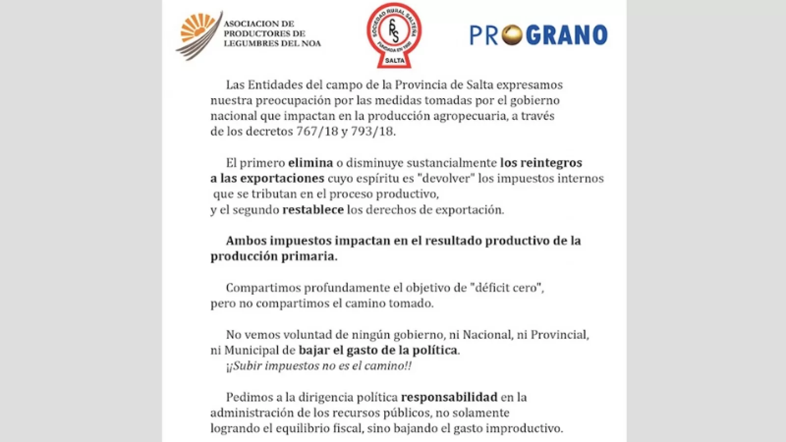 El comunicado, que firman la Asociación de Productores de Legumbres del NOA, PROGRANO y la Sociedad Rural Salteña, aclaran que “el primero de los decretos elimina o disminuye sustancialmente los reintegros a las exportaciones cuyo espíritu es ´devolver´ los impuestos internos que se tributan en el proceso productivo, y el segundo restablece los derechos de exportación. Ambos impuestos impactan en el resultado productivo de la producción primaria”.