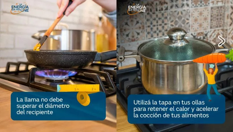 • Ajustar la llama de las hornallas al diámetro del fondo de los recipientes y mantenerlos tapados. La llama que sobresale no aporta mayor calor al recipiente y si está destapado se pierde temperatura.