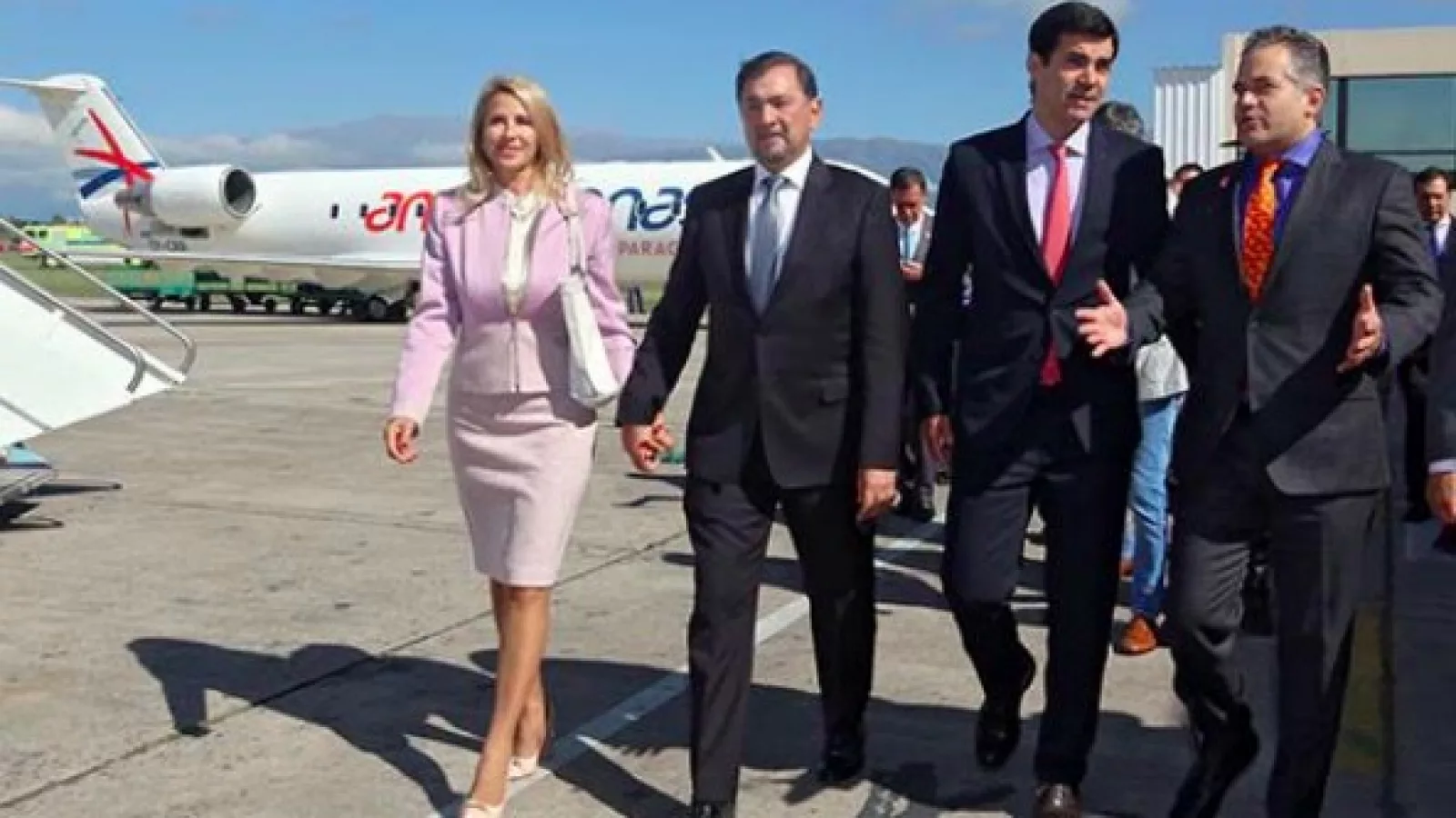 Al pie de la escalinata del avión, el Gobernador se encontró con las autoridades que conformaron el pasaje de este primer viaje integrado por el presidente ejecutivo de la línea aérea, Sergio de Urioste; el embajador de la República Argentina en Paraguay, Eduardo Zuain; y el presidente de Dinac Aeronáutica Civil de Paraguay, Luis Aguirre, entre otros.