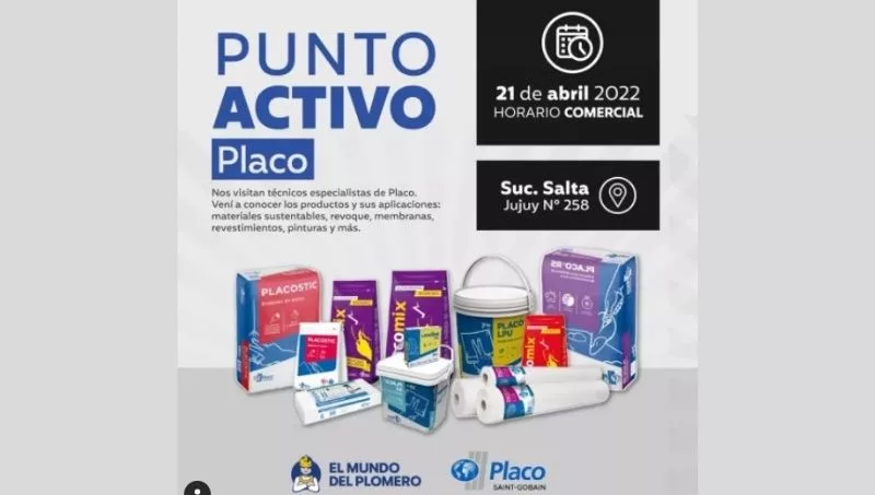 La sucursal Salta de El Mundo del Plomero (Jujuy 258) hoy será punto activo Placo y recibirá la visita de técnicos especialistas de Placo Argentina, quienes presentarán productos y sus aplicaciones para cada necesidad. Se trata de materiales sustentables, revoque, membranas, revestimientos, pinturas y otros.