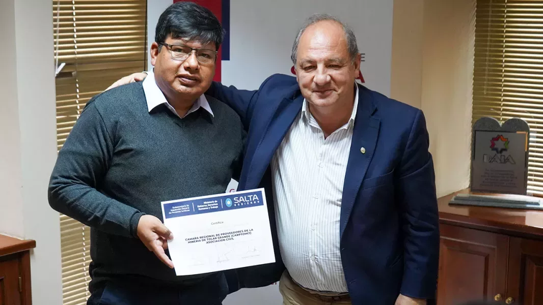 La Cámara Regional de Proveedores de la Minería de Tolar Grande recibió su personería jurídica de manos del ministro de Gobierno, Ricardo Villada. Este instrumento legal certifica su existencia y la actividad social que desarrollan en la comunidad.