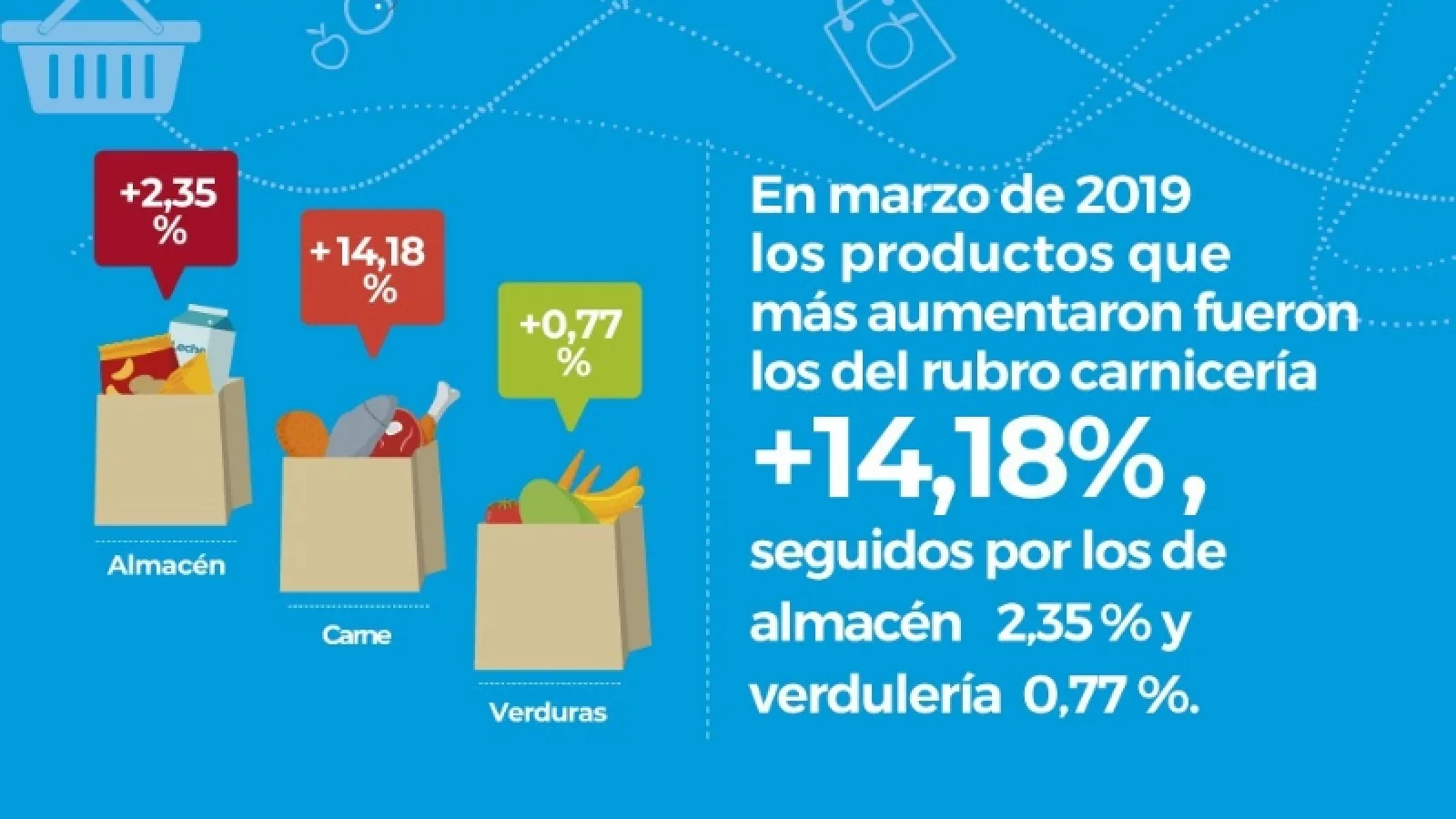 Siempre de acuerdo a sus mediciones, durante el último mes los rubros que más aumentaron fueron: Carnicería (14,18%), seguido por Almacén (2,35%) y verdulería (0,77%).