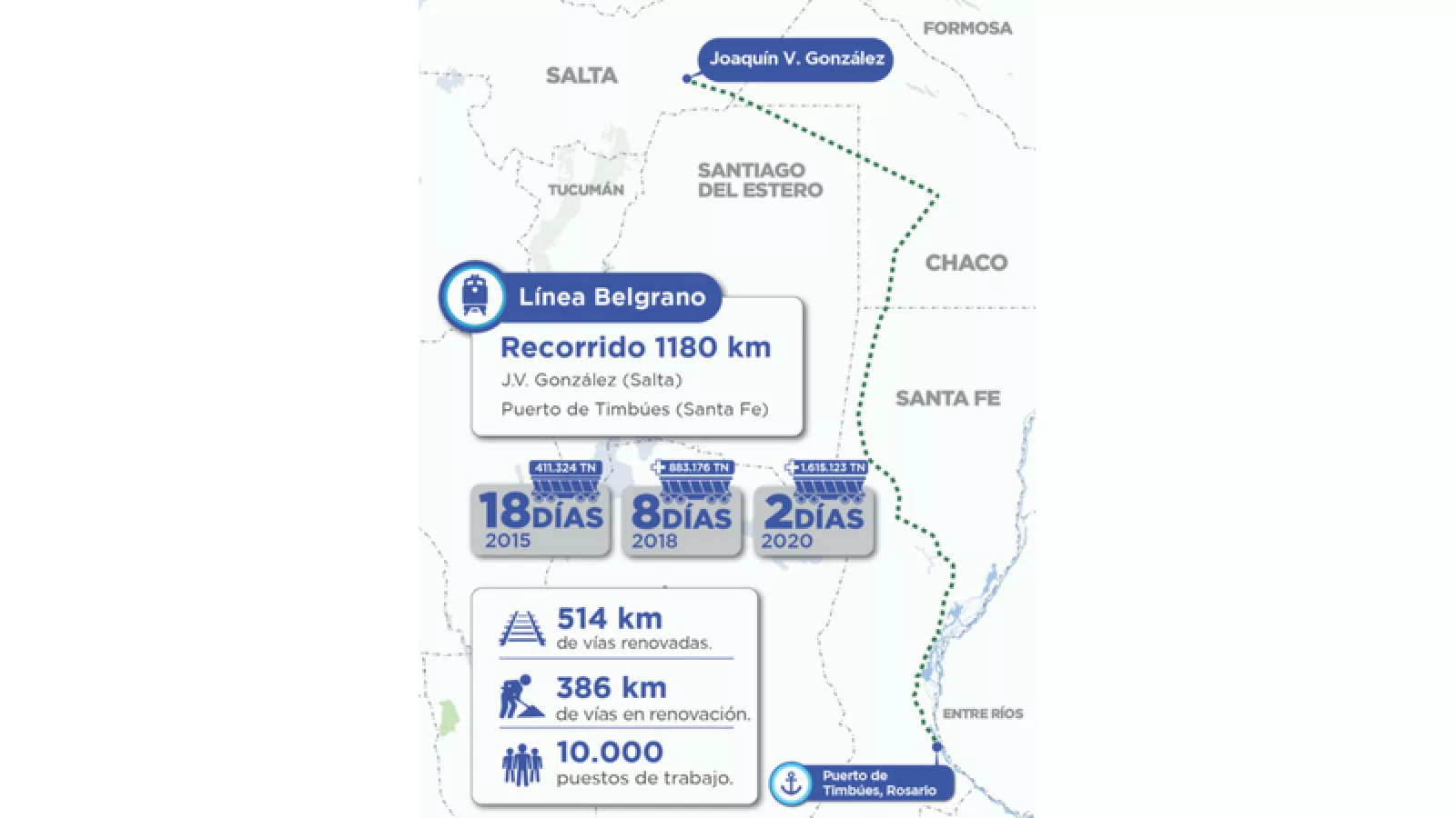 Es importante señalar que la Línea Belgrano completó su nueva flota: tiene 40 locomotoras y 1.000 vagones de diferente tipo con tecnología para mejorar la operatividad y competitividad del tren de carga.