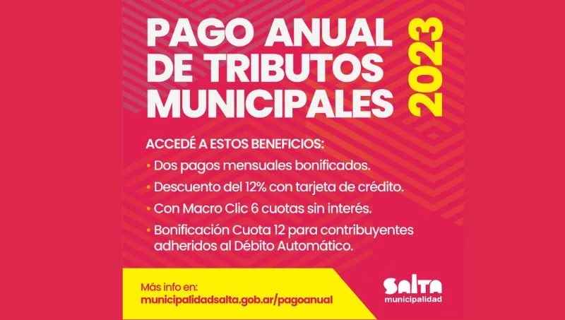 Para el pago anual online, los contribuyentes deberán ingresar a https://municipalidadsalta.gob.ar/pagoanual y seguir los pasos indicados, según los tributos que elijan pagar y su modalidad de financiación. También, desde la página se podrá imprimir la boleta del pago anual para abonar en Rapipago, Pago Fácil, Cobro Express, Banco Santiago del Estero y sucursales del Banco Macro.
