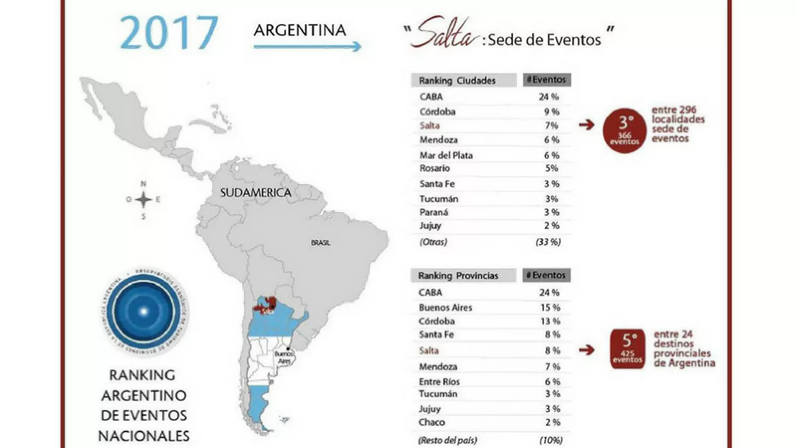 En Buenos Aires se presentó esta semana el anuario estadístico 2017 del Observatorio Económico de Turismo de Reuniones de la República Argentina, donde se destacó el rol que ocupa Salta en el turismo y principalmente en materia de congresos y convenciones. Durante la presentación se informó que la provincia de Salta registró 425 eventos nacionales durante 2017, incluyendo congresos y convenciones, eventos corporativos y deportivos.