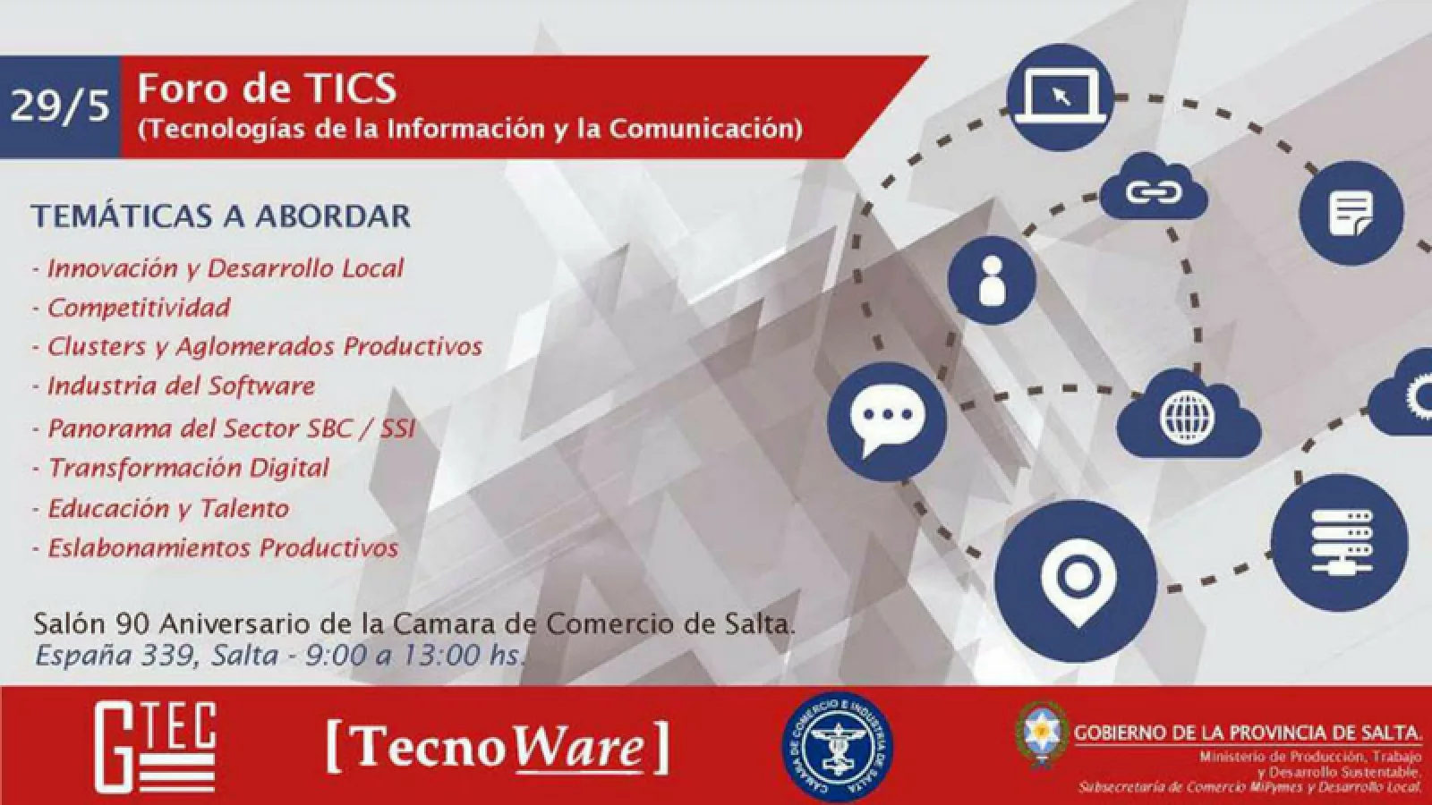 Mañana martes 29, en sede de la Cámara de Comercio se llevará a cabo el Foro TICS - Tecnología de la Información y la Comunicación. E?l evento es impulsado por la Red Nacional de Gestores Tecnológicos, y su objetivo es propiciar un encuentro entre referentes del sector empresario de TICS, y expertos en la materia para analizar y discutir sobre la transformación y la revolución digital a fin de conformar un clúster tecnológico de Salta.