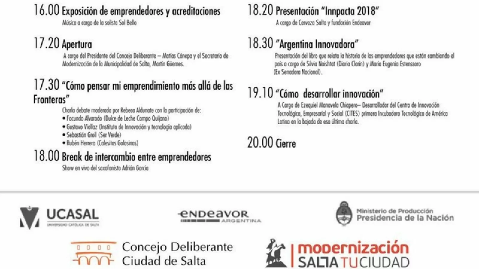 En la oportunidad se desarrollará un “living” de empresarios exitosos de la región, quienes harán su presentación contando sus historias de vida y cómo alcanzaron el éxito con sus emprendimientos, buscando reforzar y mejorar las capacidades productivas de los presentes. Entre los empresarios estarán Facundo Alvarado de Dulce de leche Campo Quijano; Gustavo Violaz del Instituto de Innovación y Tecnología Aplicada (IITA); Sebastián Groll de la empresa Ser Verde; Humberto Rubén Herrera de Calesita Golosinas y Andrés Jara de Nubimetrics.