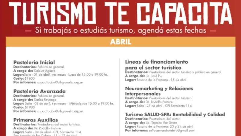 En el marco del Programa Anual de Formación para el sector turístico, durante el mes de abril se brindarán capacitaciones gratuitas de formación para prestadores turísticos. Las actividades son organizadas por el Ministerio de Cultura, Turismo y Deportes junto a las cámaras y sindicato del sector.